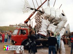 Seen 26.8.89 Havens Festival . Amsterdam . The Dutch police took an instant dislike to this piece of mobile art for some reason .. so subsequent journeys were confined to the back of a flat-bed ! Photo = Dave Fawcett