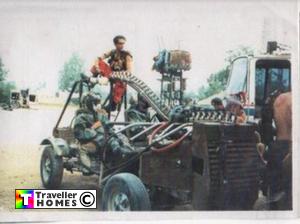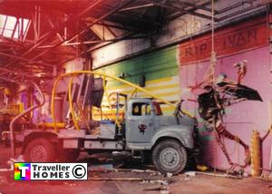 Seen 1987 Pilton . Somerset . At one stage it had been used as a tour bus by Androids Of Mu (1979-81) Then lived in & passed to someone on a London site , where it was burnt out . Joe then mutated the remains . Last seen in Alexandria Palace , after which it was impounded & scrapped !