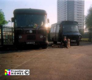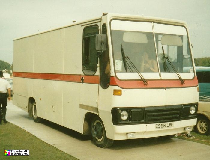 Seen 26.5.90 Inglestone Common Festival . Avon . Previously used by the Rosson n the Rosson Newton family for living and working with Zippo Circus & towed a Showmans' . Jamie later started changing its original petrol 300 engine for a 330 diesel , but never got the job completed . So it was impounded after a site eviction in 1992 , then stalled it coming out of the pound & so it was towed to a scrapyard !..