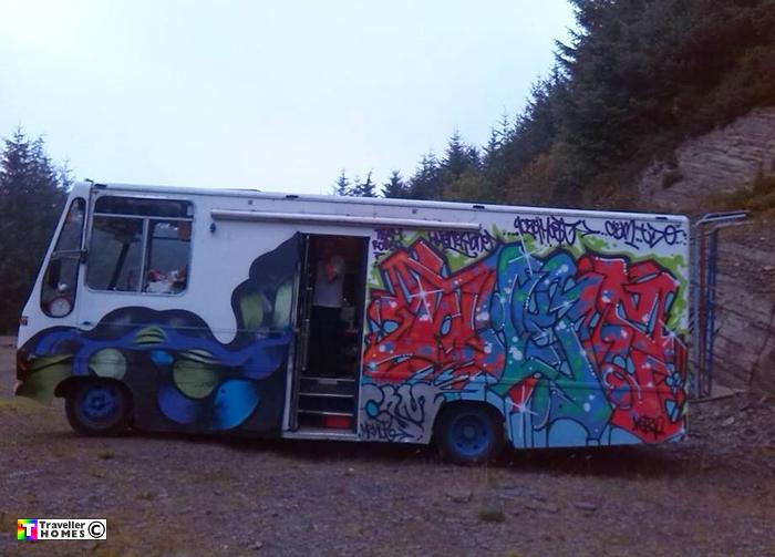 Seen ? Used by Davie 1991-6 , bought from Evv'sin Kent who'd replaced its 330 petrol engine with a 220 diesel . With his partner , 2 kids , dogs n goats they travelled around Scotland , Ireland (where the windscreen modification was carried out using VW Golf windows after drunken Tinker's had trashed the original ones) Wales & sold back in Scotland at Gorebridge site & last seen looking rough at Gallashiels site . Photo = Jeff .