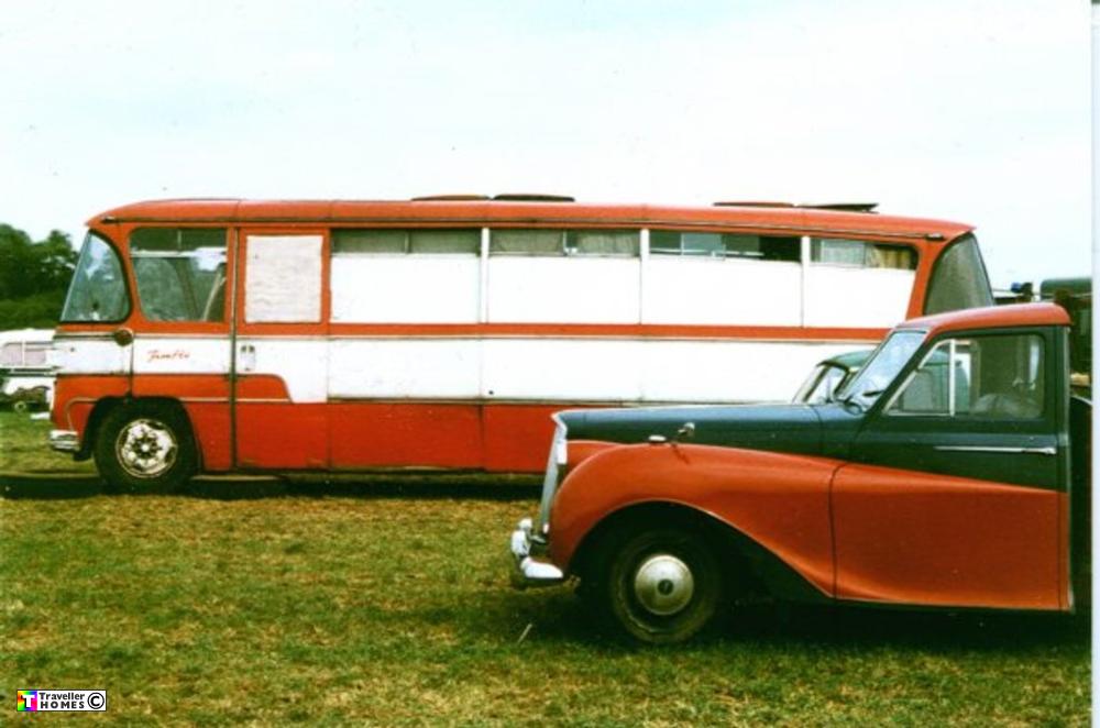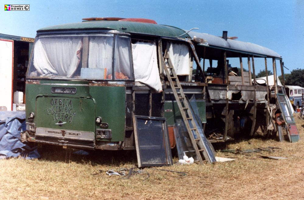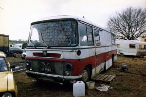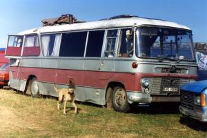 Seen 10.9.89 Green Deserts 'Harvest Fayre' . Suffolk . From the rear section it looks as if Phil and Sheris's coach had previously been transformed as a car or bike transporter ?. Later scrapped on site at Hempnell and seen by Neil Pickford in Jordan's scrapyard in 1992 ..Photo = Dave Fawcett