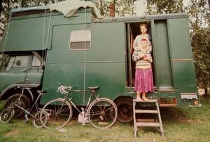 Seen 5.88 Calleva Festival . Aldermaston . Berks . Also seen in 1987 at the Rollright Stones festival without the tarped rear unit fixed onto it . Previously owned by Grevil , who'd built a lutoned box with reclaimed planking for a European tour . Photo = Dave Fawcett