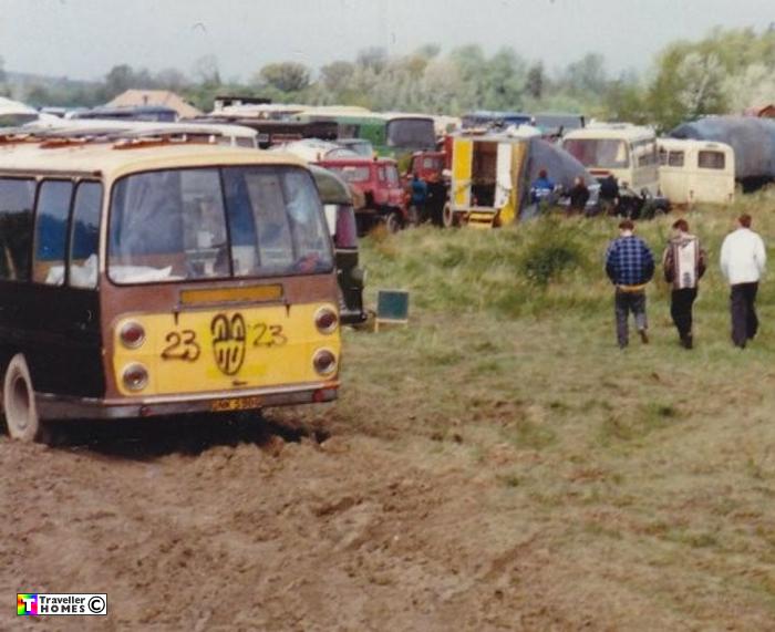Seen 30.4.89 Uffington 'White Horse' Beltane Festival . Originally owned by Schmitt & Sue , then Matt who'd rebuilt its engine & had only just sold it before being wrecked during a police enforced move from a Swindon site . Alcohol played a part in this bus hitting a tree and its arrival certainly watched by other members of the brew-crew .. Pierce & Max . Presumably it was weighed in soon after this event ? Photo = Dave Fawcett