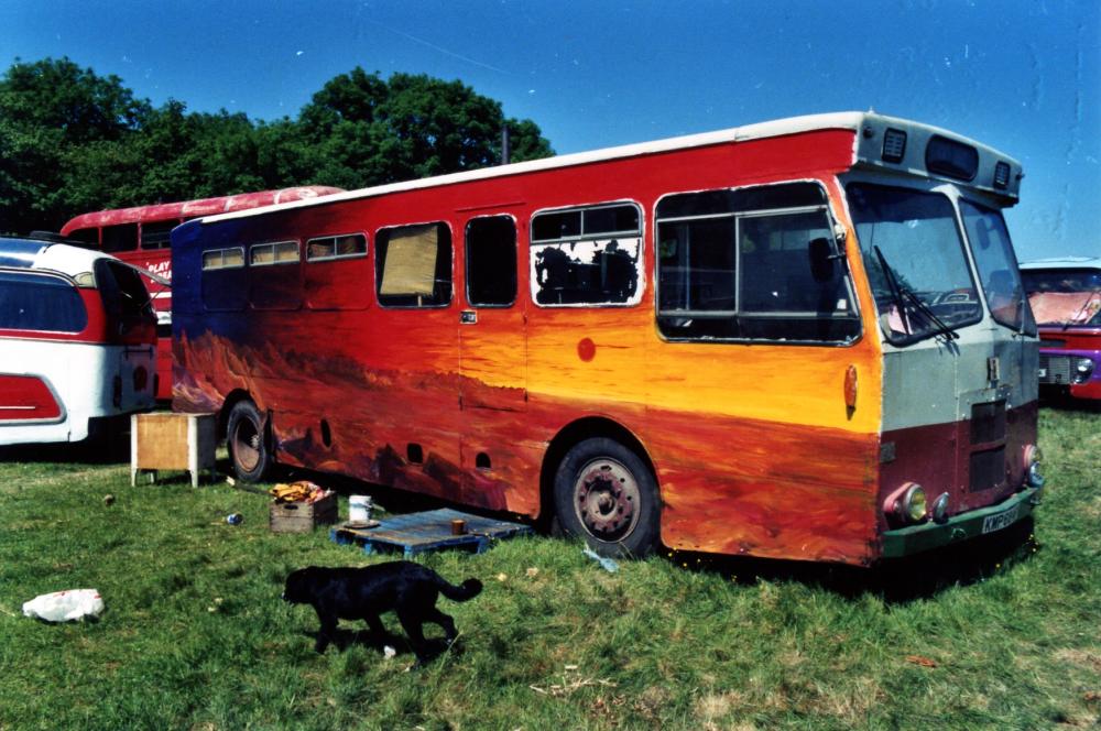 Seen 26.5.90 Inglestone Common Festival . Avon . After being used as the RDF band's bus for a short while it then became the home for Fred & Luap when they left the band . Bes's paint-job stands out well here in the UK May sunshine . It was later sold to Sarah & Skwid , with whom it was badly vandalised in a Loughborough lay-by and scrapped in 1992 . Photo = Dave Fawcett