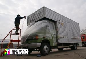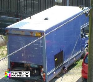 Seen 6.9.98 (82) Tarn & Garonne . France . Guy had stuck their ex-German workman's trailer onto the flat bed of one of John's ringed trucks . Photo = Dave Fawcett