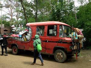Seen 9.8.03 (12) Aveyron . France . Hugo & his family travel around Europe in this & even suss home education for the kids , which is rare and not easy here . Photo = Dave Fawcett