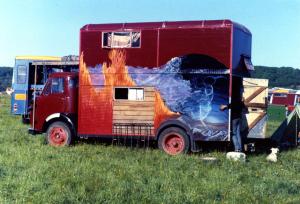 Seen 25.5.91 Sodbury Common Festival . Avon . 'Ex'-horse box was not really correct as Adrian used it to transport his stallion Stanley . Later lived in by Matty & Charlotte & their daughter Martha . Photo = Dave Fawcett